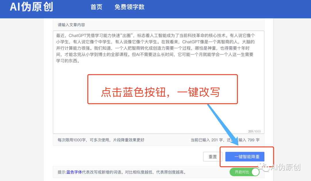 输入要改写内容,点击【一键智能降重】,原文瞬间变成新的一篇素材!