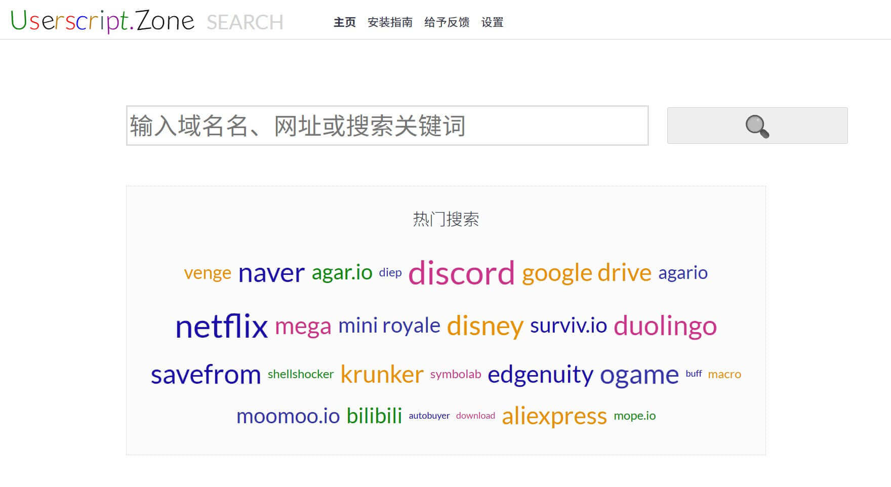 访问 userscript.zone,在搜索框输入要增强的网站域名或关键词,回车搜索。