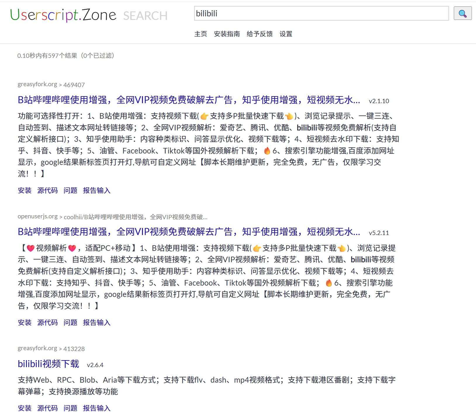 比如我这里输入B站的关键词“bilibili”,搜索到的脚本都是可以处理网页版B站的脚本。