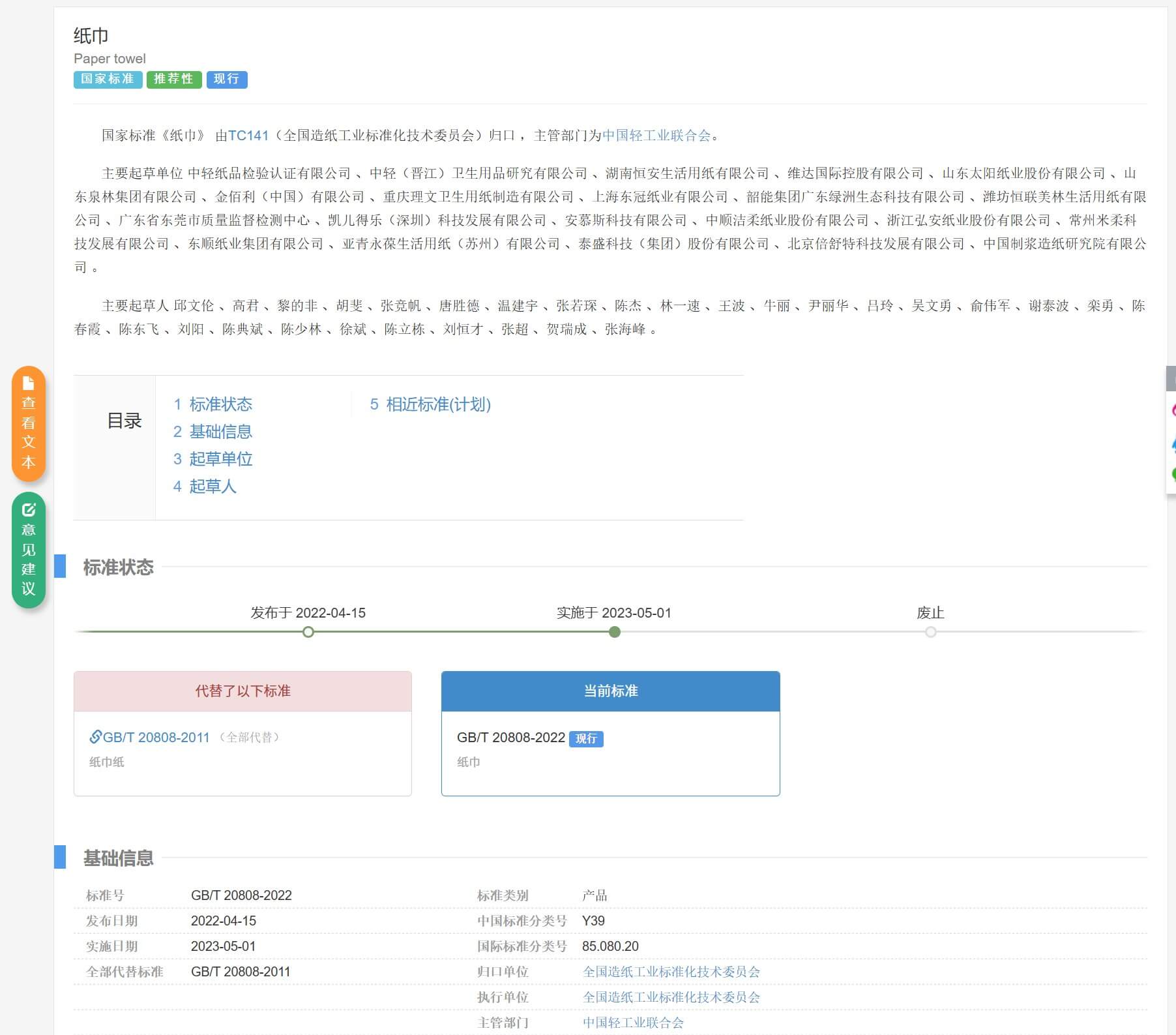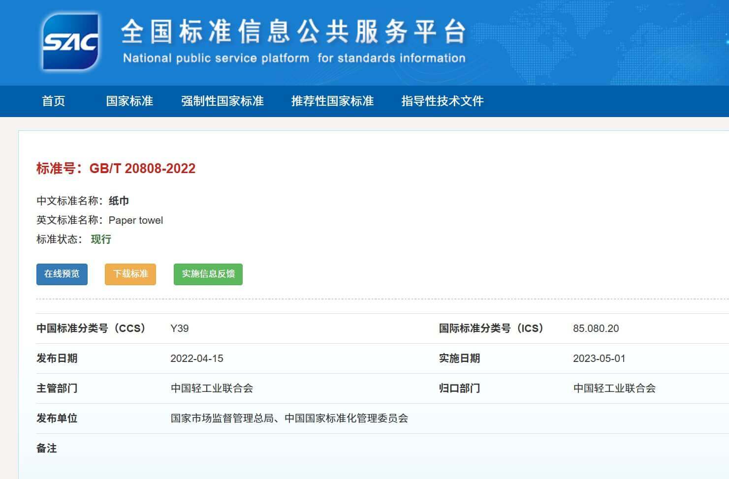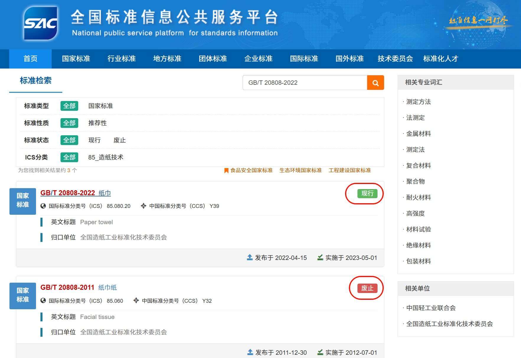 比如现行的纸巾标准:GB/T 20808-2022 ,我们直接搜索这个标准号就能找到详细内容。